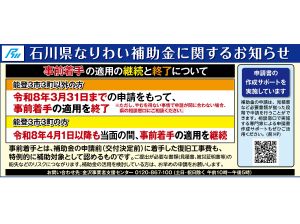 【石川県商工会連合会】 【能登半島地震で被災された能登3市3町以外の事業者のみなさまへ】なりわい再建支援補助金の事前着手の適用と終了について