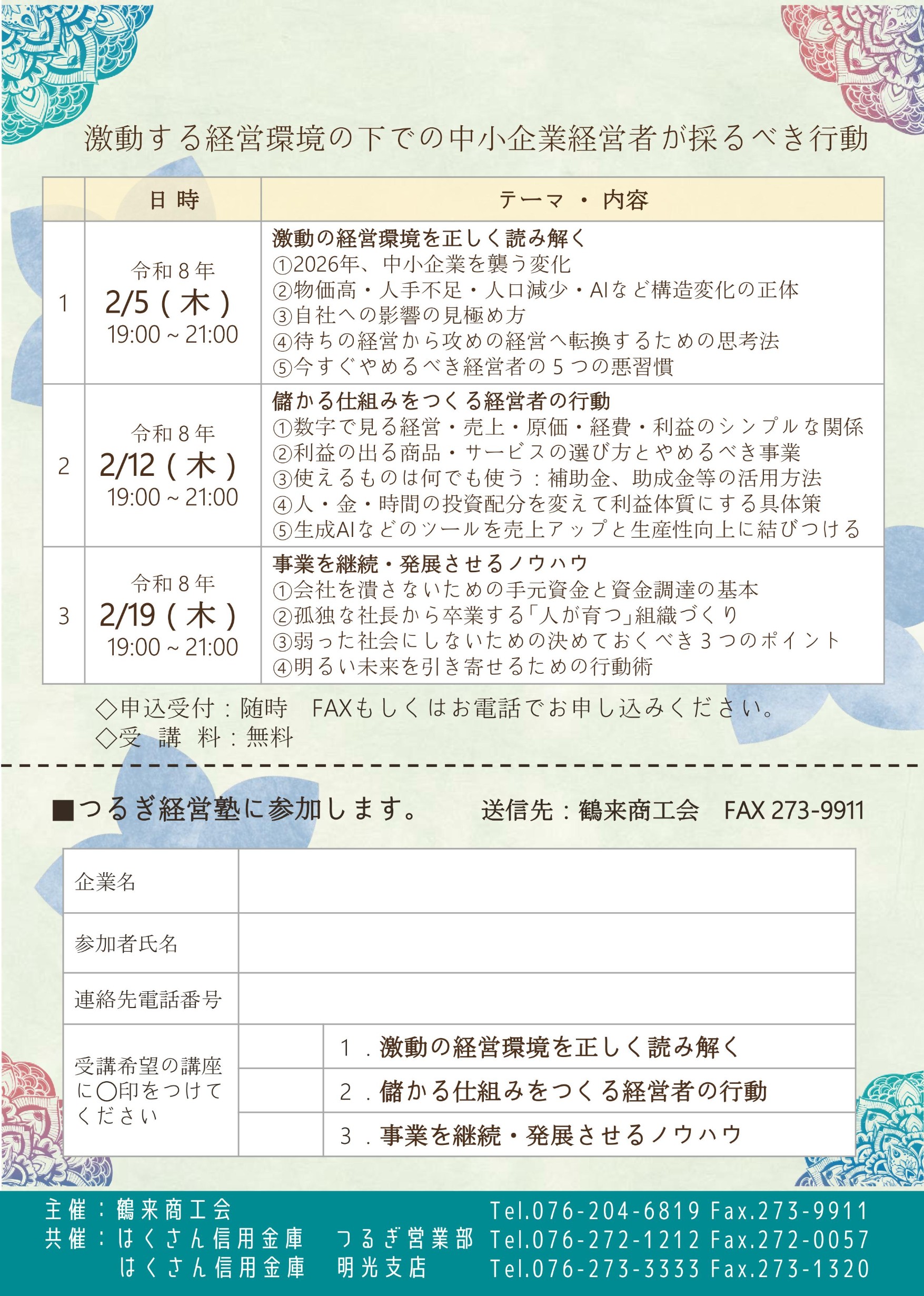 今年度は、激動する経営環境の下での中小企業経営者が採るべき行動と題し、以下のとおり3日間、気持ちを新たに開催いたしますので、奮ってご参加ください!