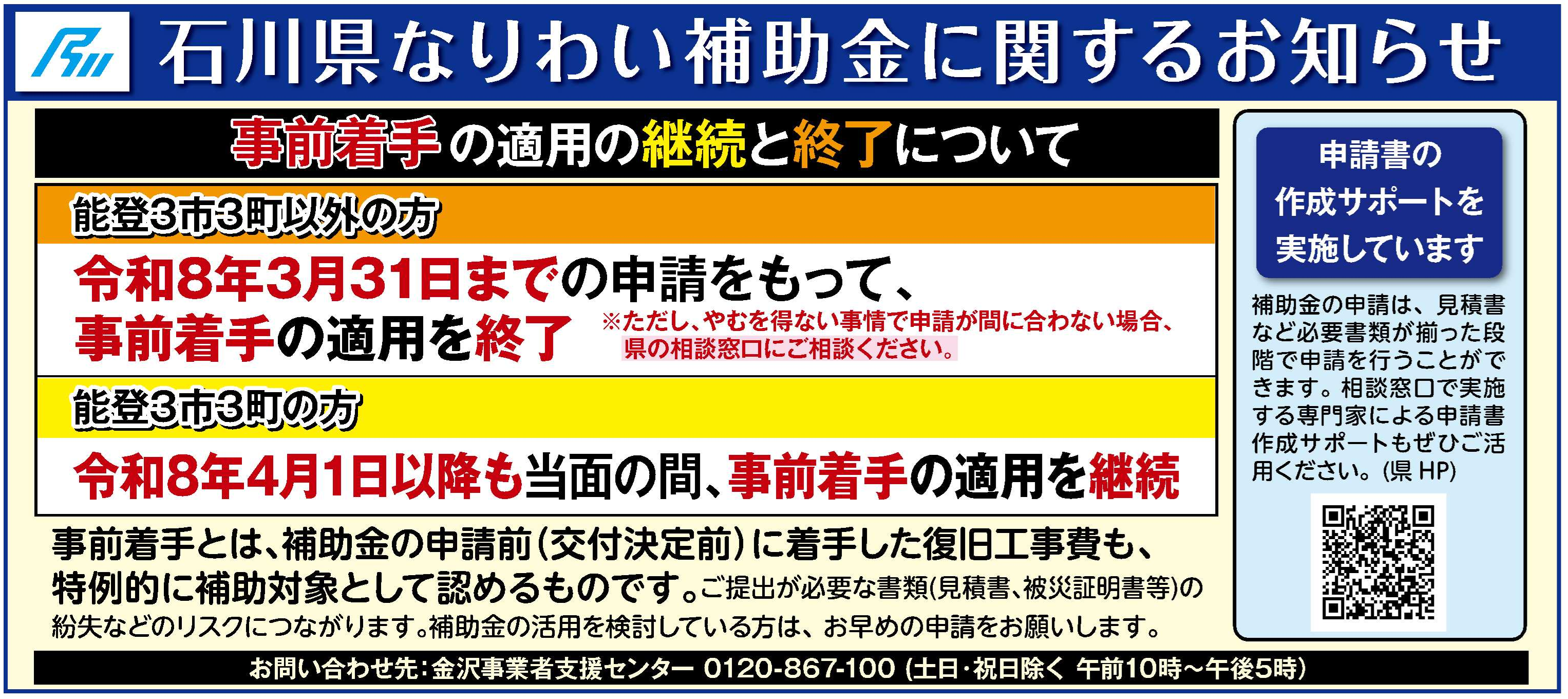 【能登半島地震で被災された能登3市3町以外の事業者のみなさまへ】なりわい再建支援補助金の事前着手の適用と終了について